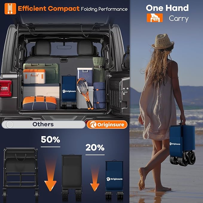 - ใ๐ฃ๐ฟ๐ผ๐ฑ๐๐ฐ๐ ๐ฆ๐ถ๐๐ฒ & ๐๐ฐ๐ฐ๐ฒ๐๐๐ผ๐ฟ๐ถ๐ฒ๐ใOriginsure folding carts unfolded size: 48.43"x 24.02"x 24.41"(42.52"), folded size๏ผ9.84"x 12.99"x 24.41", wheel size๏ผ7"x 4", handle height from Ground: 42.52", with 1 Side Pocket, 2 Mesh Cup holders, 1 Storage Cover, and 1 Strap. Ready to use right out of the box, no assembly required.