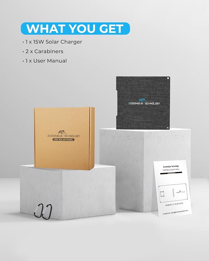 - Package Includes: 15W Solar Panel* 1, Carabiners* 2, Manual* 1. We offer a 12-month warranty. If you encounter any issues with the product, please get in touch with us, and we will respond within 24 hours
