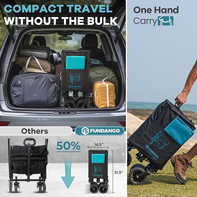 - FOLDABLE & COMPACT DESIGN FOR EASY STORAGE: This foldable wagon is designed for convenience—it quickly folds down to a compact size, easy to carry with one hand and simple to store in your car trunk, garage, or closet. When fully expanded, it offers ample space for all your gear. The perfect combination of compact storage and large capacity