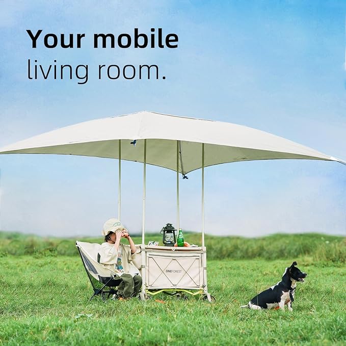 - It can be used as a wagon cart, a camping table, or as a mobile living room with a canopy installed.