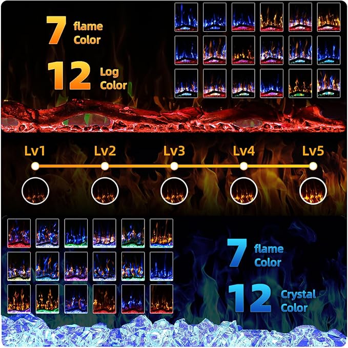 - πβ Personalized Ambiance, Lifelike Flames: Enhance your home with our deluxe electronic fireplace, offering lifelike flames that capture the essence of a real fire. Select from 5 flame speed & brightness settings, 12 carbon bed colors, and 7 flame hues to craft your ideal ambiance.Customize your look with a large log, various decore log and crystal options, seamlessly fitting any style, whether modern or rustic. Experience comfort and charm in one beautiful package!