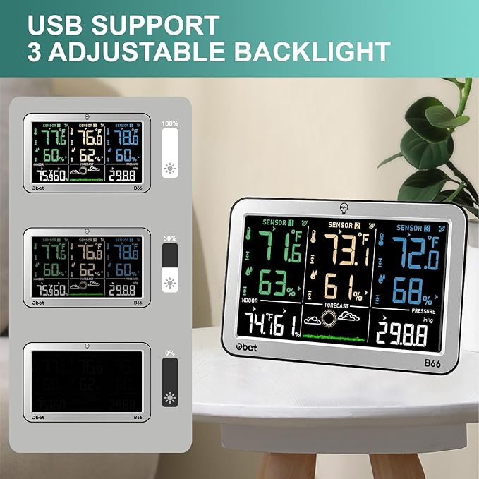 - USB Support 3 Adjustable Brightness: Home weather station is designed to be easy to read in any lighting condition with 3 adjustable backlight settings: high, low, and off. When connected via USB, the backlight stays on continuously for clear visibility, while on battery power, it automatically turns off after 10 seconds to save energy.(The package does not include a USB plug)