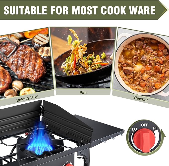 - 🌸【Sturdy and Durable】Made of cast iron and metal frame, it is resistant to high temperatures and rust, suitable for a variety of outdoor cooking needs. The upward sloping baffle provides better support, and the baffle's hooks make it easy to hang a variety of utensils.The burner outdoor stove is coated with weather-resistant power and made of reinforced iron to ensure sturdiness and stability, durable and can ensure long-term outdoor use