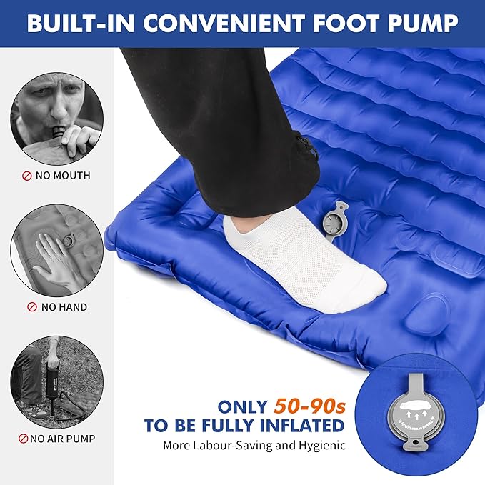 - 🏖️【Quick Inflation & Deflation】Simply foot stomp to inflate, allowing you to inflate your campping sleeping pad within 2 mins only and also avoids introduce moisture into the interior by mouth blowing. And the deflation valve has the double-decked design with a multi-functional which is used for fast deflating.