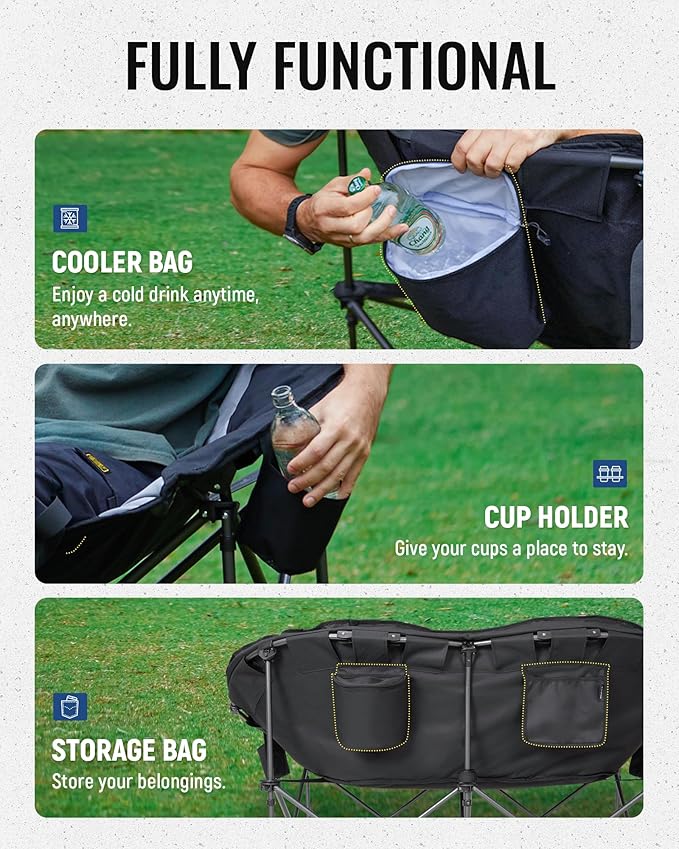 - 【Durable & Heavy Duty】Made with reinforced steel tubing, 600D Oxford fabric, and a dual vertical support system, this heavy-duty camping loveseat holds up to 660lbs. Anti-slip feet, fixed anchor points, and upgraded locking straps add exceptional strength and long-lasting durability across all terrain.