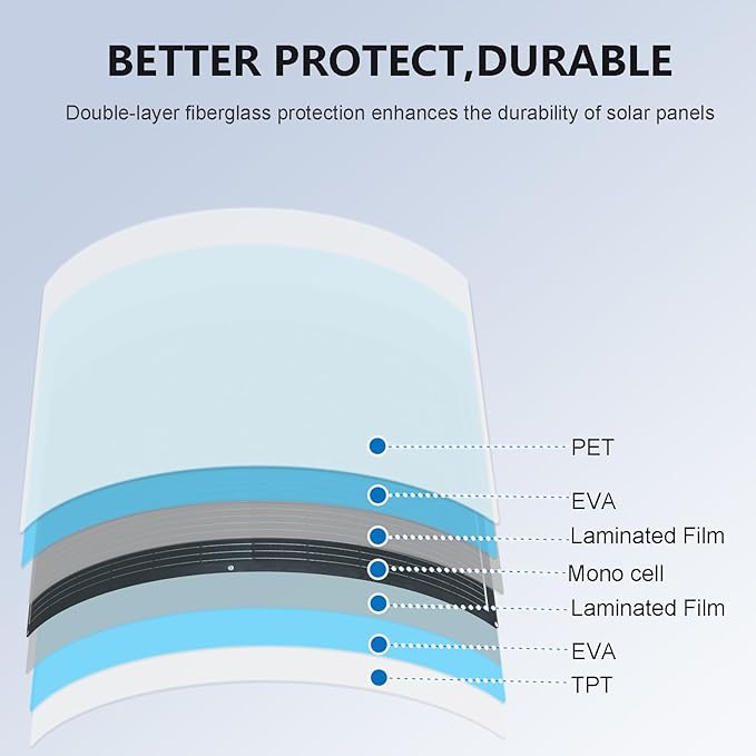 - Dual-Layer Fiberglass Protection.The solar panel is reinforced with a dual-layer fiberglass composite film, significantly enhancing impact resistance and minimizing the risk of damage to the monocrystalline solar cells.