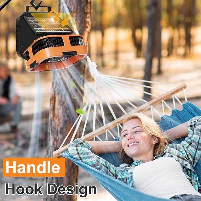 - ⛱️Easy to Carry: This camping fan rechargeable has a foldable handle and lightweight build, making it perfect for beach trips, picnics, and backpacking. Stay cool anywhere—your go-to solar powered fan for adventures!