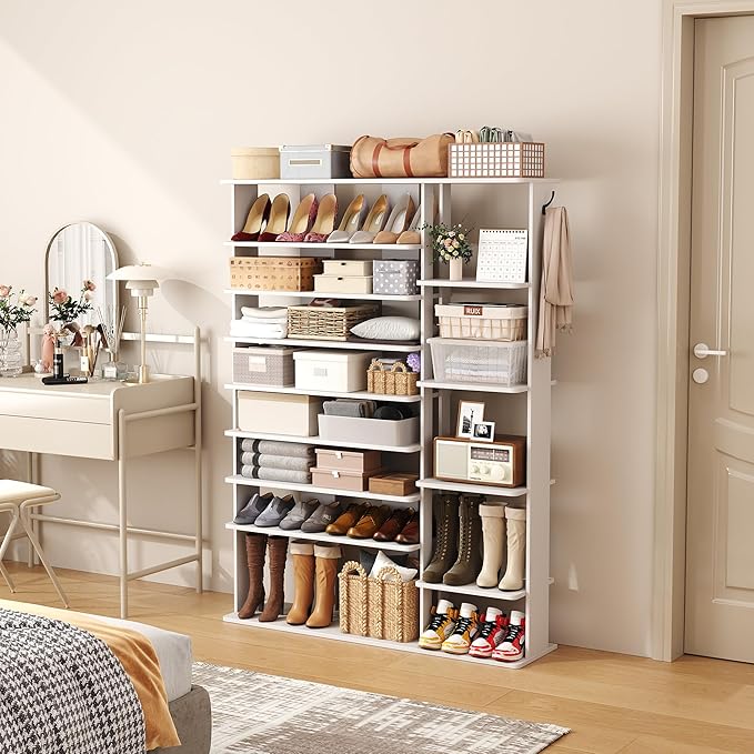 - Multi-functional Storage Shelf: This freestanding shoe storage rack is designed to maximize your storage space. It not only serves as an effective shoe organizer but also functions as a display rack for your daily essentials. It is ideal for use in the living room, foyer, hallway, or bedroom. The tall shoe shelf is equipped with two sets of anti-tipping devices for wall mounting to ensure safety. Additionally, it features hooks on both sides of the vertical shoe rack, perfect for holding keys, purses, umbrellas, and other items.The interval distance of the open shelves ranges from 6.1 to 12.67 inches, making it an ideal choice for diverse storage demands.
