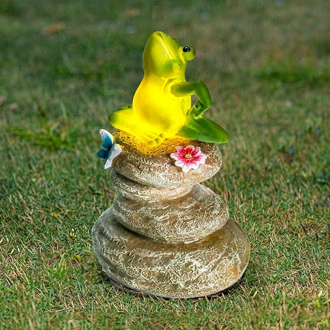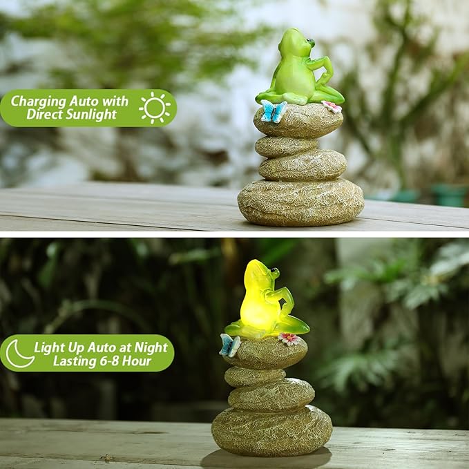 - 【Solar Garden Decorations】Frog garden is powered by solar, easy to charge and use. frog solar light will turn on automatically when dark to make this yoga frog statues more unique and adorable and at night