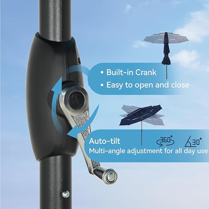 - Easy to Adjust: This umbrella Outdoor patio is designed with crank opening system and easy to adjust, it can be easily opened, closed and tilted from 0-45° through the hand crank adjustment, which is easy and quick to use, and it can provide more angle of shade protection and better shading effect.