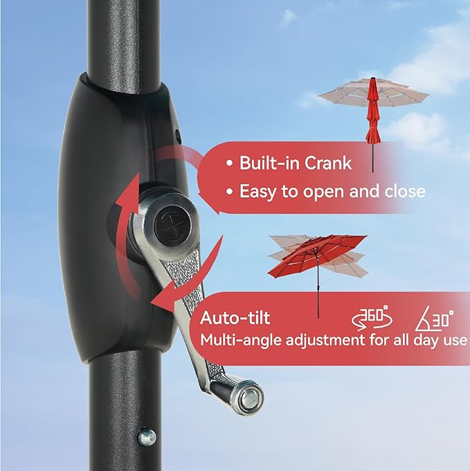 • Easy to Adjust: This umbrella Outdoor patio is designed with crank opening system and easy to adjust, it can be easily opened, closed and tilted from 0-45° through the hand crank adjustment, which is easy and quick to use, and it can provide more angle of shade protection and better shading effect.