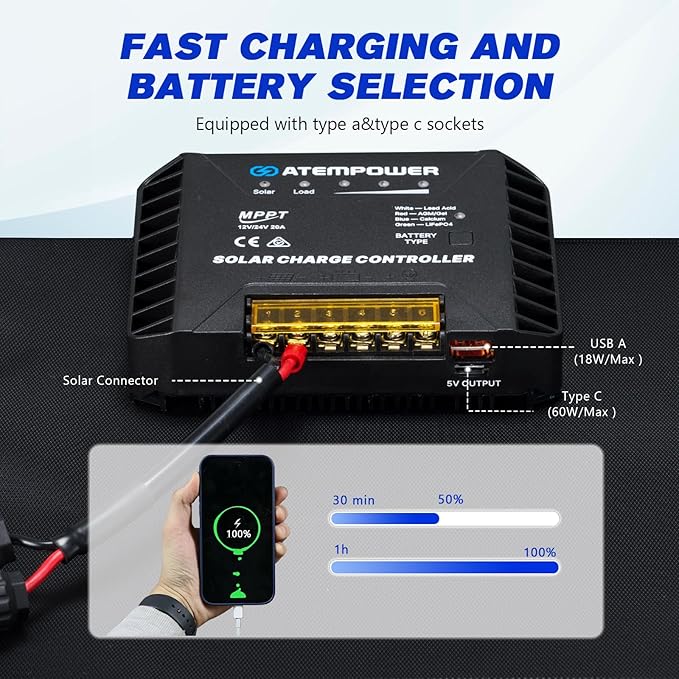 - ☀【Efficient MPPT Charging】: The MPPT controller in our solar blanket kit powers up your batteries, charges 12V accessories, and activates sleeping LiFePO4 batteries. Solar power kit compatible with Lead Acid, AGM, GEL, Calcium, and LiFePO4 batteries, this controller meets all your energy needs. Plus, with USB ports, you can charge smartphones, tablets, and more—perfect for life on the move!