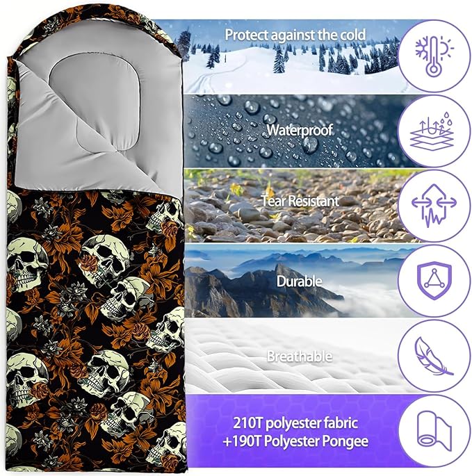 - Premium Material - The camping sleeping bag is made of premium 220T ripstop microfiber fabric,comfortable and breathable,lined with 220T cotton pongee. The waterproof outer protective shell is made of a unique hexagonal design and high-quality Material with double S-stitching and microfiber filling for optimal warmth and insulation to protect you from the elements. The bright colors are loved by boys and girls,great for kids and adults alike!