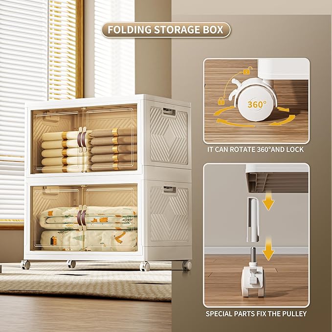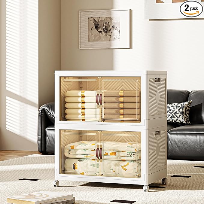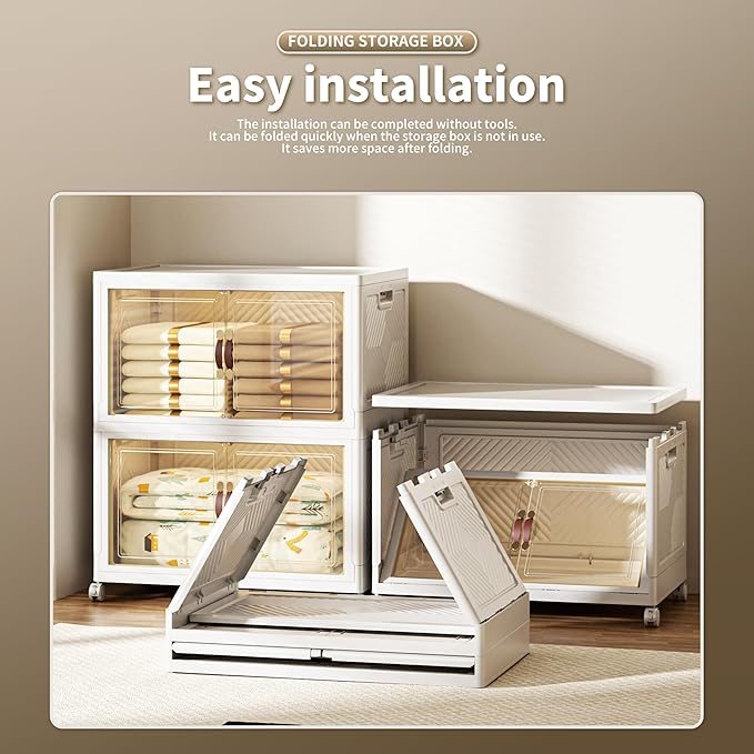 268 QT / 67 Gal Collapsible Storage Bins with Wheels & Magnetic Doors - Stackable Plastic Cabinet Organizer for Home, Garage, Closet (White Space-Saving Containers)