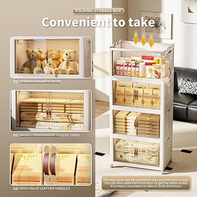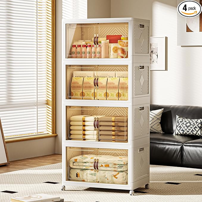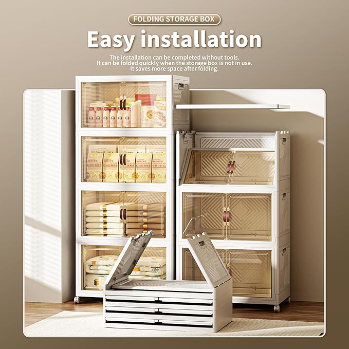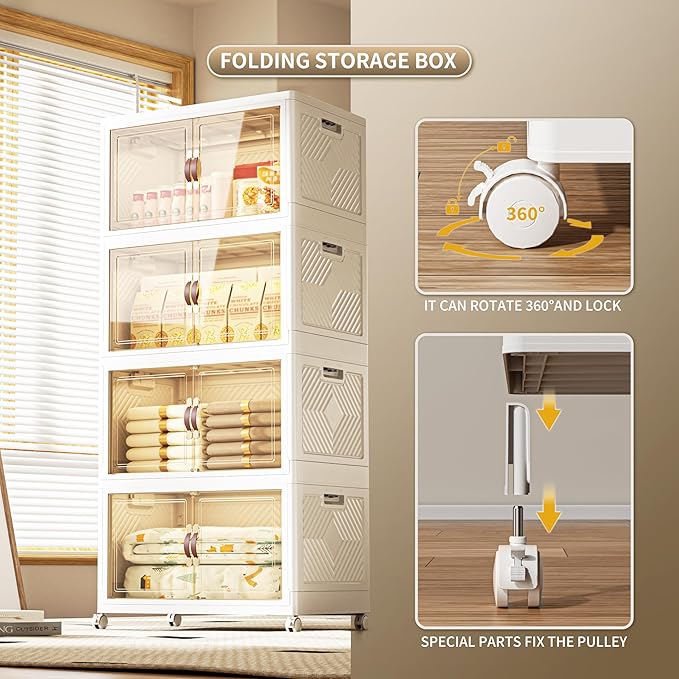 532 QT / 133 Gal Collapsible Storage Bins with Wheels & Magnetic Doors - Stackable Plastic Cabinet Organizer for Home, Garage, Closet (White Space-Saving Containers)