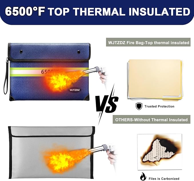 • ⚠️(Note) Fireproof does not mean it can withstand a long fire, and waterproof does not mean it can be immersed in water for a long time.It just gives you enough time to rescue your valuables. 🔥【6500°F Top Fireproof】The upgraded fireproof bag has passed the global flammability standard (US laboratory) and vertical burning test (SGS UL94 V-1) and can withstand temperatures up to 6500°F, far exceeding the typical fire temperature.
