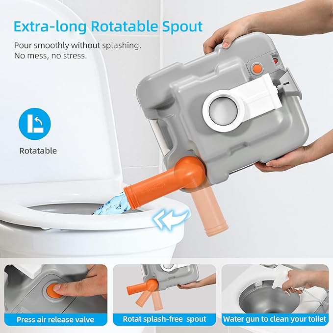 - Odorless, Splash-proof & Easy to Carry: Built with a leak-proof, odor-sealing valve, our rv toilet keeps liquids and smells securely contained. Its splash-proof rotatable spout makes emptying easy, and the detachable design and storage bag ensure easy transport