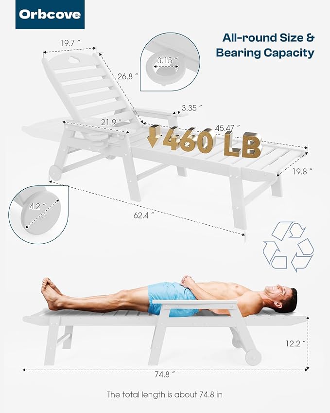 - SPACIOUS DESIGN WITH WIDE ARMRESTS & CUP HOLDER: With A Generous Size Of 30"D X 20.9"W X 6.3"H, This Outdoor Lounge Chair Accommodates Users Of All Body Types, Supporting Up To 400 Lbs. The Wide Armrests Offer Added Comfort, While the Built-In Cup Holder Keeps Your Drinks Within Easy Reach. Whether You’re Hosting A Gathering Or Enjoying A Quiet Afternoon, This **Chaise Lounge Outdoor Is Your Go-To Relaxation Spot.