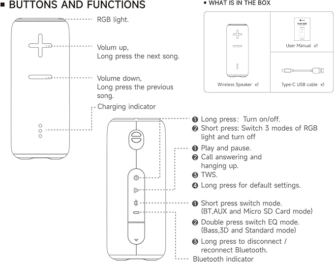 - 3 EQ Modes + UP to 8H Playtime for Nonstop Entertainment : Switch between Standard, 3D Surround, and Bass Boost modes to optimize sound for open-road motorcycle rides, poolside floating, or home parties. The up to 8+ hour battery keeps the music going all day, whether you're camping, biking, or relaxing by the water