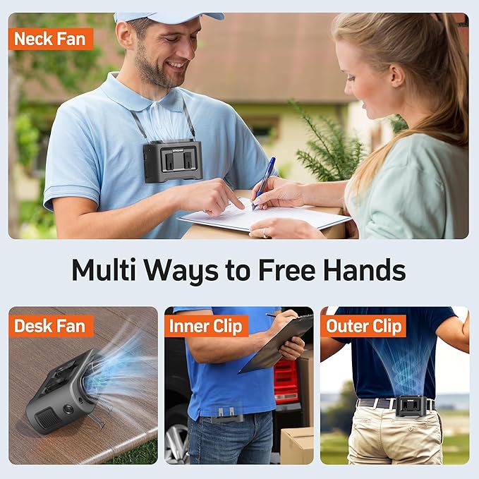 - 2X Air Outlets: Equipped with dual motors and air outlets, this clip fan offers stronger airflow and larger cooling coverage. Also comes with 2X belt clips, shirt clips, stands, and a lanyard, making it perfect for hands-free use during hiking, climbing, or biking