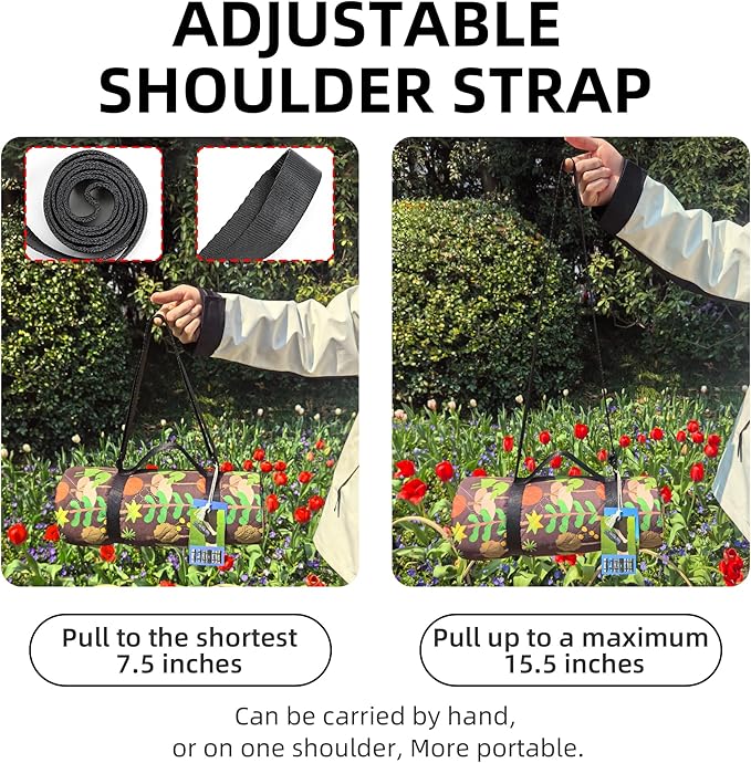- Easy to Fold & Lightweight: picnic blanket can shrink down to a very portable size of 15''x 5''. With the help of the velcro, it will not loose easily and take too much space. The strap can be adjusted to different lengths to meet different carrying ways, you can carry it by hand, put on shoulders, which free up your hands when holding too much.The weight of the mat is only 2.3lbs, you can fold it with simple steps, carry or store it anywhere you want.