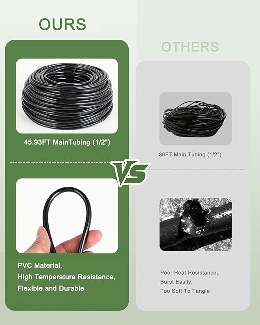 - ๐ฟ 177FT Comprehensive Drip Irrigation Kit โ Covers 300 Sq. Ft.: This high-efficiency micro drip irrigation system covers up to 300 square feet, ensuring consistent watering for all your plants in one go. Installation is effortlessโno digging or plumbing skills required! The kit includes: 1 45.93ft 1/2 Inch Main Line + 1 131.23ft 1/4 Inch Distribution Line + 10 Drip Irrigation Emitters Vortex + 10 Drip Emitters Spray + 8 1/2 Inch to 1/4 Inch four way connector + 16 Nozzles + 16 Tee + Tubing End Plugs + Water Connector + 1 Instructions Guide.