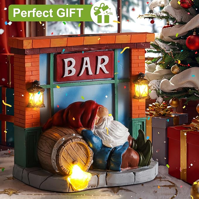 - Funny Drunk gnome Design:Crafted with a charming and fun drinking gnome.(8.2*8.6*5.1inch) With a total of 3 lights that shine brightly,adding a lovely glow at night.With our naughty gnome statue,he will express the color and character of your garden. Whether as garden decorations or makes a funny gag gift for family and friends, they are guaranteed to raise a smile