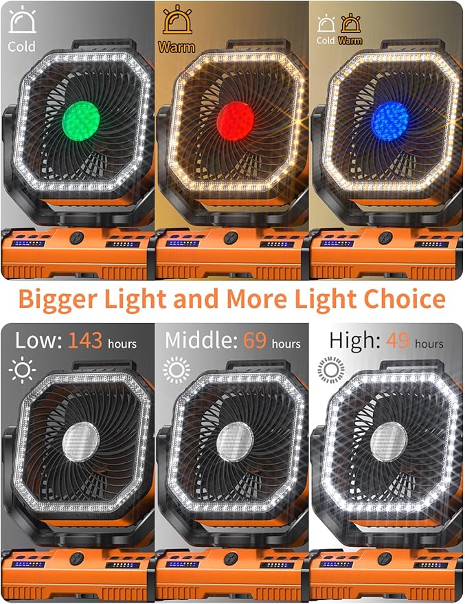 - 3 Levels of Brightness & 3 Color Temperature - This camping tent fan with LED latern can light up the enviroment when it's dark. 3 color temperature, warm/cool/warm&cool, provide more choices than other fan to meet your preferences. From low brightness to high brightness, a fully charged battery fan can be used for 143-68-49 hours.