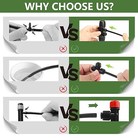 - 【More 1/2" Tubing and Couplers = Enhanced Water Pressure No More Dry Spots】Our watering system is equipped with 1/2" to 1/4" barbed tees and a 33 FT 1/2" hose that maintains stable water pressure throughout the entire system, ensuring each sprinkler head receives the optimal amount of water.