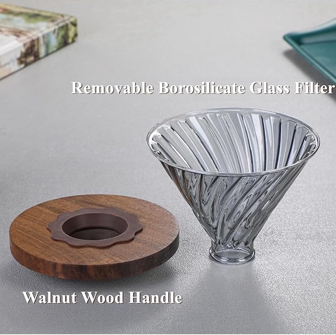 - Borosilicate Glass Coffee Server--This coffee dripper and the coffee pot are made of high quality borosilicate glass, that cold and heat resistant, and it will not absorb odor. The base of filter cup is made of walnut wood, and the filter paper is made from natural wood pulp without any bleaching.