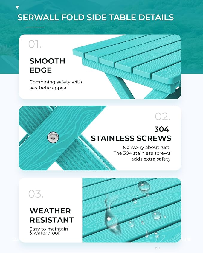 - [Foldable Outdoor Side Table] The SERWALL Adirondack Side Table features a foldable design that significantly reduces its footprint when folded, providing an optimal space-saving solution for outdoor enthusiasts.
