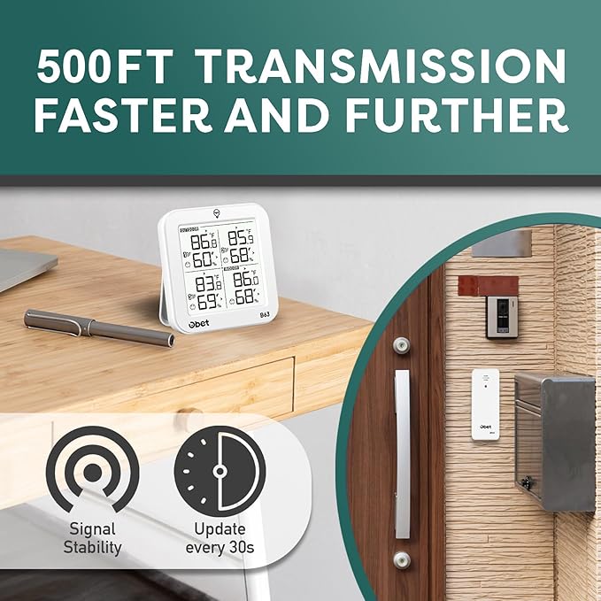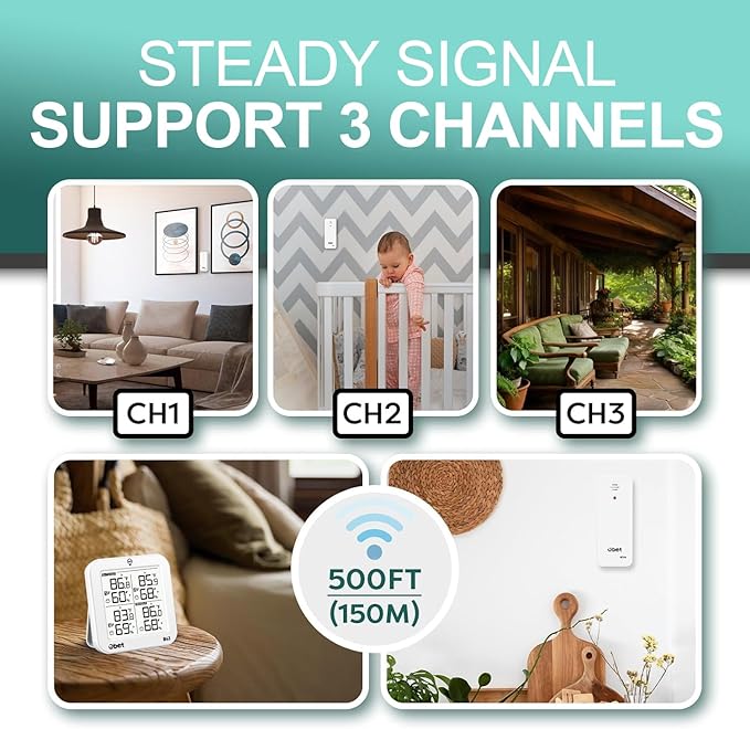 - Indoor Outdoor Thermometer with 3 Sensors: Stable signal transmission system with 3 sensors, ensuring accurate real-time readings for multiple locations. Up to 500ft (150m) long range, suitable for RV, living room, bedroom, garage, incubator or garden.