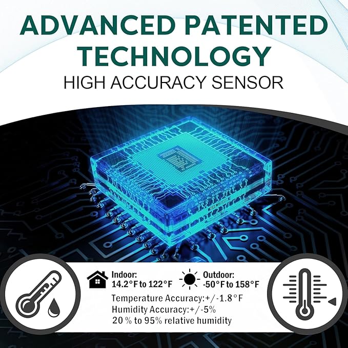 - High Accuracy Sensor: Respond to minuscule environmental changes. Temp accuracy within +/-1.8℉, humidity accuracy within +/-5%. Outdoor temp range: -50 ~ 158 ℉, humidity range: 20%~95%.