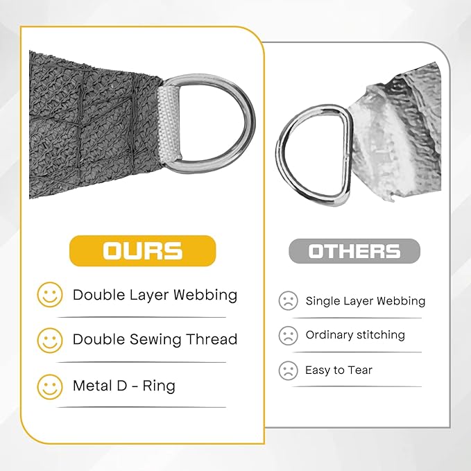 - ?�Sun Shade Sail Material?? Made of 185 GSM UV-protected high density polyethylene(HDPE) shade fabric, features strong stitched seams, durable stainless steel D-rings in each corner for easy attachment, adopts double-sided stitching technology, is tear-resistant. Even with strong sunlight, our sun shade sail can still maintain its original appearance.
