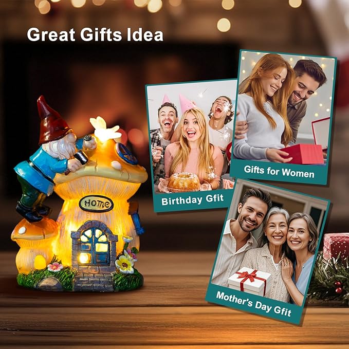 - 【Unique and Creative Design】This solar garden gnome statue is full of fantasy and creativity with the theme of gnomes building mushroom houses. Place it in the courtyard, as if you are instantly in the fairy tale world, adding a unique charm to your outdoor space.