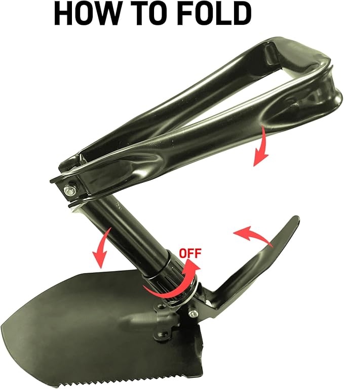 - 3-IN-1 MULTIPURPOSE: Features a versatile design with a 180-degree shovel, 90-degree pickaxe, and 90-degree pick hoe. The tactical military shovel is a rugged tool for digging, shoveling, sawing, chopping, and entrenching. Whether you are backpacking on a wilderness adventure or preparing for an emergency, this emergency shovel is a vital necessity in the great outdoors.