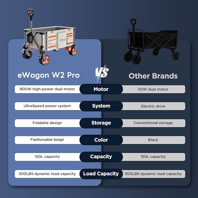 - [Powerful Motor and Load Capacity] This electric folding cart is equipped with a 900W dual motor, which is powerful and easy to handle various road conditions. The entire machine weighs only 28.88 pounds, making it lightweight and easy to carry, with a load capacity of 200 pounds, meeting advanced demands. The 150-liter storage space can accommodate tents, backpacks, picnic supplies, etc., to meet the needs of outdoor travel.