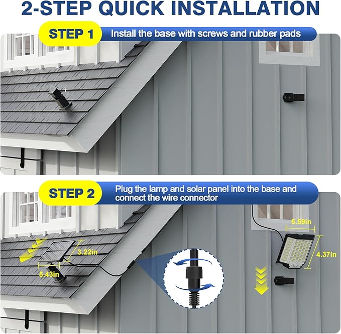 - 【Beveled Panel Design】 Unique three-panel config (vs. single-plane) delivers 270° panoramic light—erasing shadows in driveways, yards & patios. Angled panels maximize coverage, paired with 120° motion detection (26ft range) for robust security. Two install options: Separated: 16.4ft cable splits solar & light panels—mount light under eaves, solar in full sun for flexible placement. Combined: Solar panel integrates above light for direct wall mounting on decks/fences/garage doors—all screws included for quick, tool-free setup.