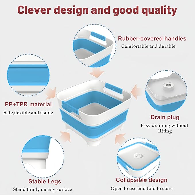 - 【Improved Design】: Our upgraded collapsible dish tub now features rubber-covered handles for a more comfortable grip and increased durability. This collapsible dish drainer is perfect for washing dishes, bowls, vegetables, and pump parts.