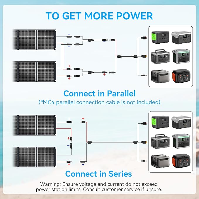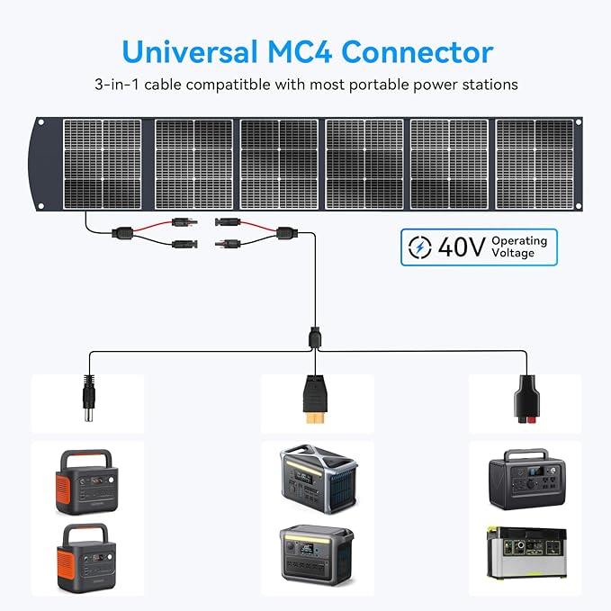 - Wide Compatibility: Compatible with power stations from EcoFlow, Jackery, Bluetti, Anker, etc. Includes a 3m MC4 cable and adapters (XT60, Anderson, DC8020) for easy setup.