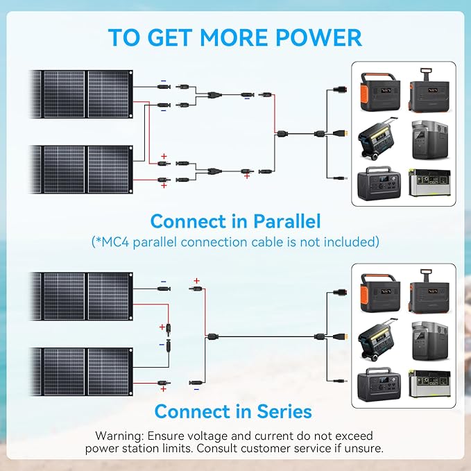 - Wide Compatibility: Compatible with power stations from EcoFlow, Jackery, Bluetti, Anker, etc. Includes a 3m MC4 cable and a 0.5m MC4 to XT60, Anderson, DC8020 cable for easy setup