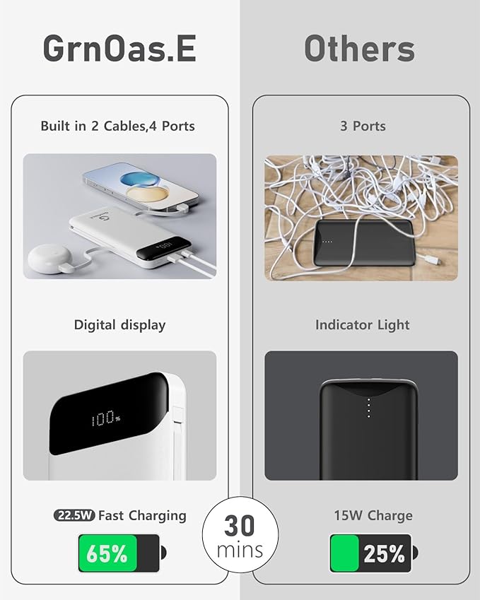 - Portable Charger with Built in 2 Cables: Portable Charger with Cords Wires,one cable (20W) exclusively for iphones,iPad,Airpods,the other USB-C cable supports 22.5W charging for electronic devices.USB C port & USB A port support 22.5W.Incredibly fast fuel your iPhone 15 form 0 to 50% in 30mins, nearly 3X faster than original chargers.Travel essentials Portable Charger with Built in Cables,don't need to carry various cables during the trip any more.