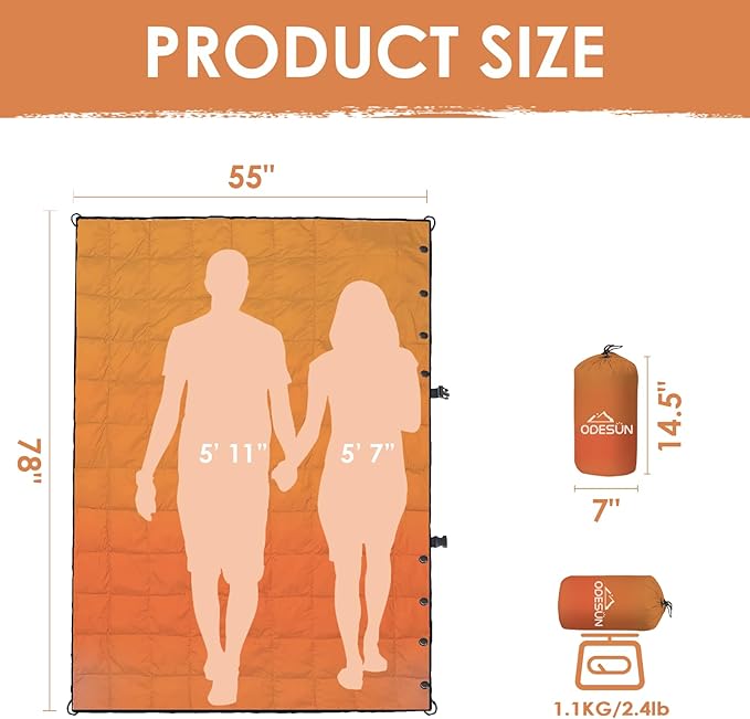 - Material and Size of the Puffy Camping Blanket: This Puffy outdoor camping blanket is carefully designed and made of high-quality down alternative puffy silk cotton, which provides excellent warmth while maintaining breathability. The front and back sides and packaging bags are made of 30D polyester fiber fabric, which is more waterproof and tear-resistant than 20D. With a moderate size of 78"55" (200cm140cm), the waterproof camping blanket is compact when folded. Machine washable, but not too often.