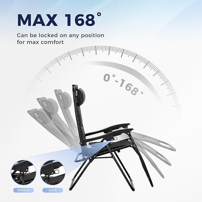 - 【Lockable Reclining System Gravity Chair】: The lock catch is more convenient to operate than twist knobs. Simply pull the clip back to lock and push the clip front to unlock. It can be adjusted at any angle from 0 to 168 degrees, smoothly glides to an ergonomic zero-gravity position