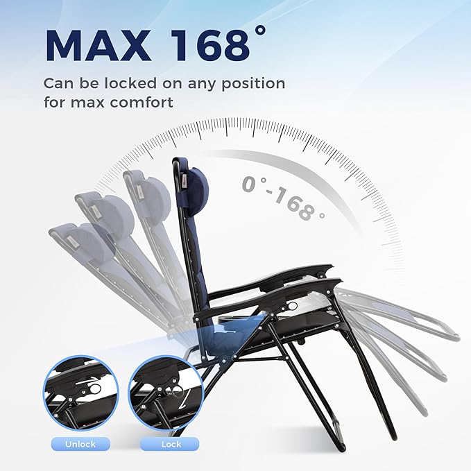 - 【Lockable Reclining System Gravity Chair】: The lock catch is more convenient to operate than twist knobs. Simply pull the clip back to lock and push the clip front to unlock. It can be adjusted at any angle from 0 to 168 degrees, smoothly glides to an ergonomic zero-gravity position