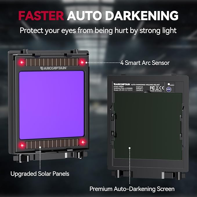- FASTER AUTO DARKENING - The helmet is equipped with 4 advanced sensors, switching from light to dark in 1/25000 seconds, protecting your eyes from harmful rays during welding operations. It is the ideal choice for TIG/MIG/ARC weldingand grinding. Light state: DIN 4, Dark state: DIN 5-9/9-13.