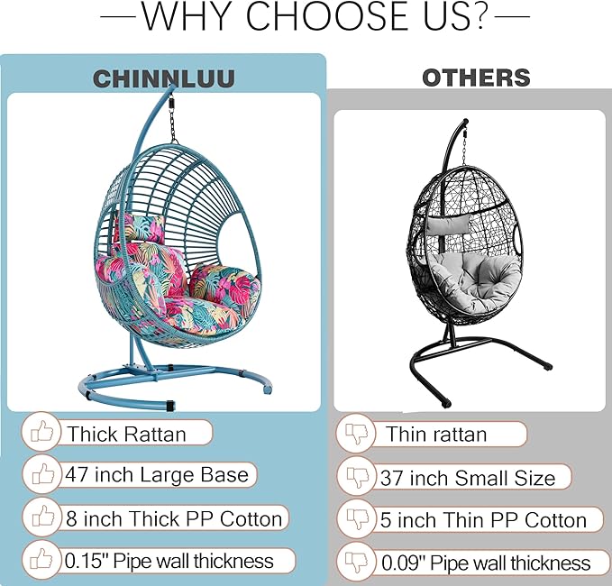 - Stable Construction - Features with sturdy solid steel frame & 47" oversized base, our swing egg chair holds 400lbs, ideal for backyard BBQ or lazy lounging time with kids/pets piling on. Won't tip over, just pure leisure time!