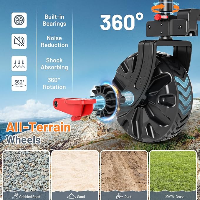 - All-Terrain Performance: 360° rotating PVC wheels with bearings ensure smooth movement on sand, grass, or slopes. Ergonomic telescoping ABS handle adjusts from 23.2-32.7 inches with secure brakes and storage cover.