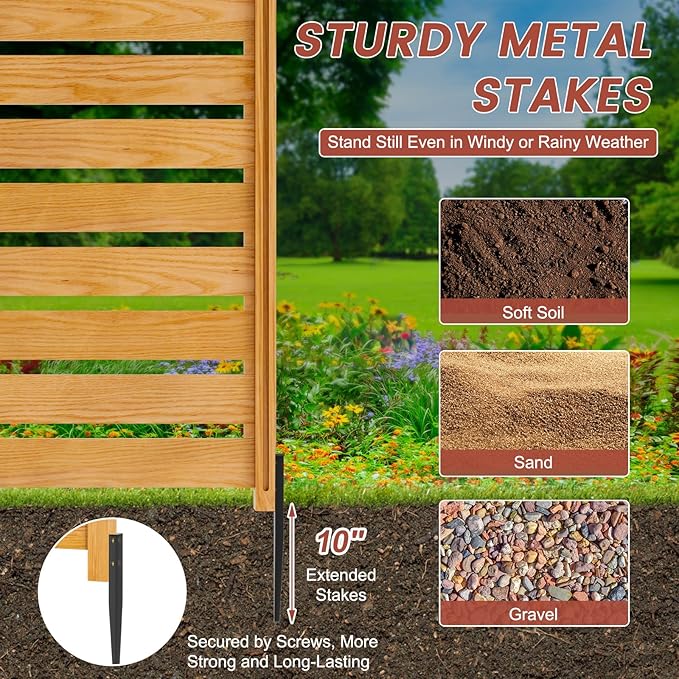 - Durable and Sturdy: It is equipped with 2 panels and 3 metal stakes, the fence panels are made of high-quality solid wood, which is weather-resistant, ensuring long-lasting outdoor use, the metal stakes can go deep into the ground up to 10 inches deep, ensuring good windproof performance, and the metal piles are not easy to overturn