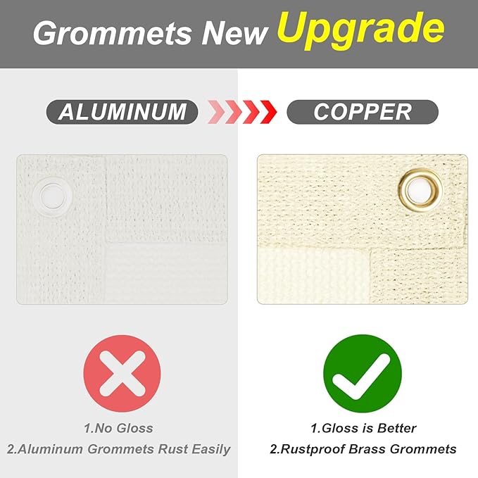 - ?�Easy to Install?‘Each shade cloth for patio is designed with heavy-duty copper grommets at 2 ft intervals, with included zip ties, ropes, and offers flexible mounting options. Please understand that due to the elasticity of the material, our shade cloth has a tolerance of ±2 inch.